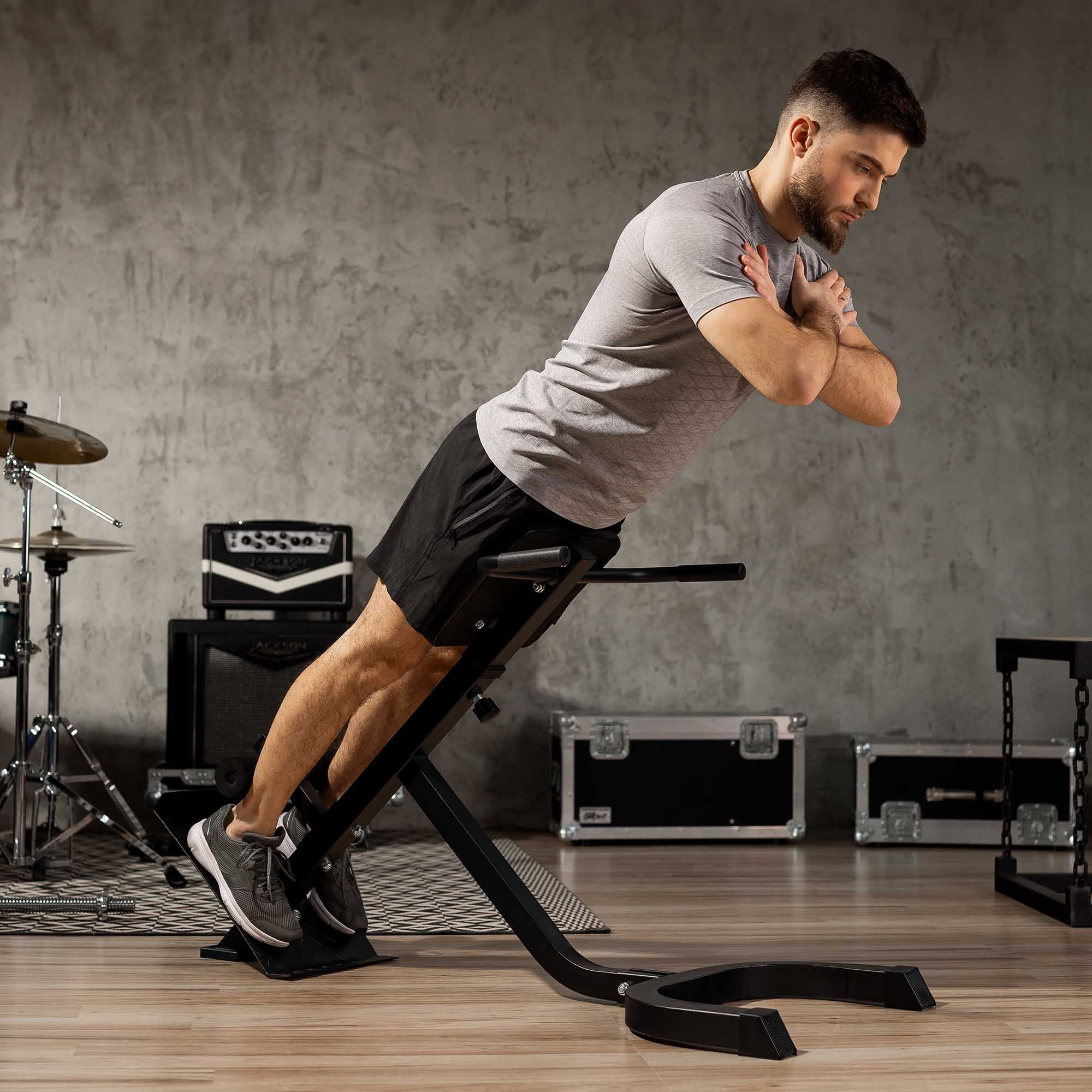 Key features include a secure leg lock system, ergonomic hip support, and additional non-slip footrests to stabilise your position during exercise. The bench is designed at a 45-degree incline, offering the optimal angle for performing back extensions and abdominal work. A wide lower support base ensures maximum stability and safety, even during more intensive sessions. With the HS-1018, you can enjoy professional-level strength and core training directly at home.