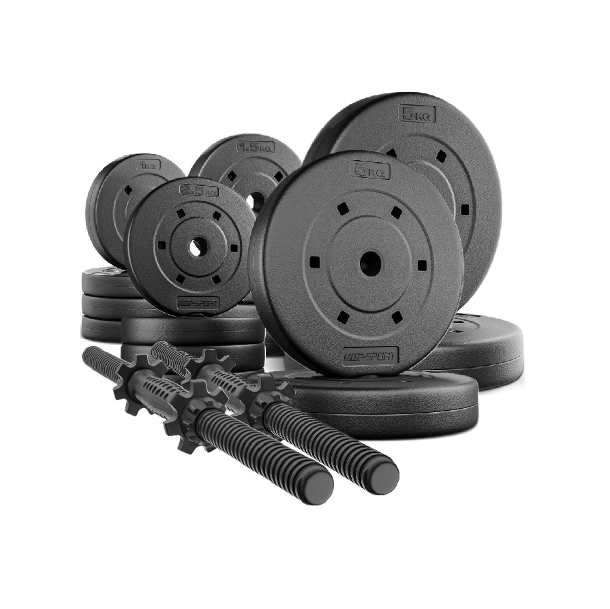 This comprehensive 40 kg dumbbell-style barbell kit includes everything you need for a complete workout at home — 2×54 cm short bars (25 mm), 2×5 kg, 4×1.25 kg, 4×1 kg, and 4×5 kg plates, plus 2 spinlock collars for each bar. The well-balanced weight distribution allows for safe progression as you gain strength. Perfect for intermediate users who want to expand from light toning into serious strength and conditioning. The modular design lets you quickly change the load for different exercises, making your home gym setup as functional as a professional one.