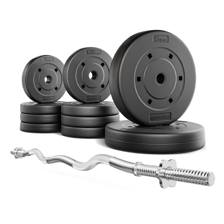The Hop-Sport EZ Starter 20 is a practical home strength-training set: a 120 cm ergonomic EZ bar minimizes wrist stress, and 20 kg of quiet composite plates allow comfortable arm and upper-body training. Threaded sleeves and star collars ensure stability, and the selection of lighter plates enables precise load adjustments as you progress.