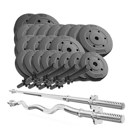 This comprehensive 80 kg barbell and dumbbell kit includes 2 x 120cm + 4×54 cm short bars, 8×5 kg, 4×2.5 kg, 4×1.25 kg, 4×1 kg, and 2×10 kg plates, plus secure spinlock collars for each bar. The combination of heavy and light plates offers complete flexibility for progressive overload, letting you tailor your training intensity from moderate conditioning to power-based lifts. Perfect for advanced athletes or home gym enthusiasts ready to push their performance limits, this kit supports a full range of workouts — from isolation curls to compound strength exercises.
