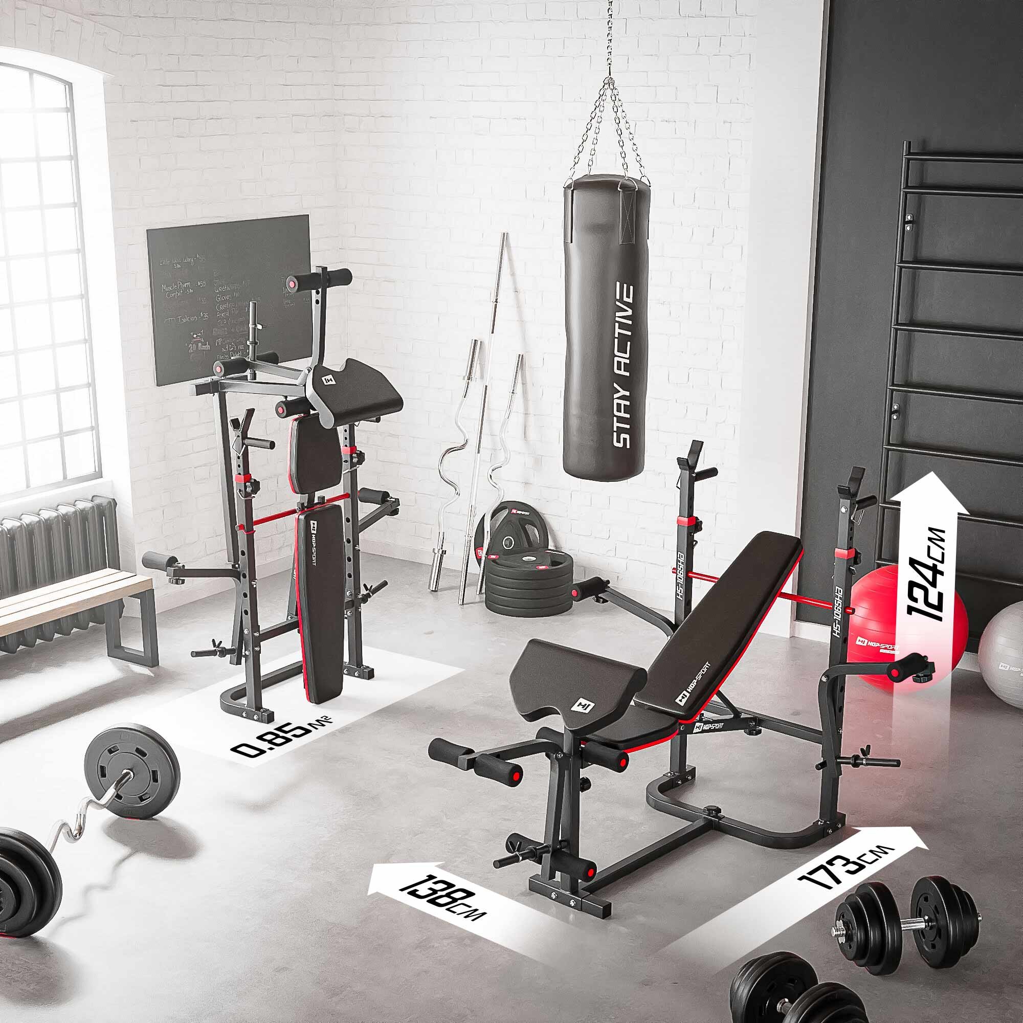 The adjustable HS-1065HB bench is the heart of the set. It features a 6-level backrest adjustment, a height-adjustable preacher curl pad (85–91 cm), barbell stands (104–115.5 cm) with safety locks, a leg developer, and a butterfly station. Thick foam padding with leather-effect upholstery ensures comfort and support for your spine, while protective foam rollers on the butterfly and leg developer make training safer and more comfortable. The steel powder-coated frame provides long-lasting durability and stability, even during intensive sessions.