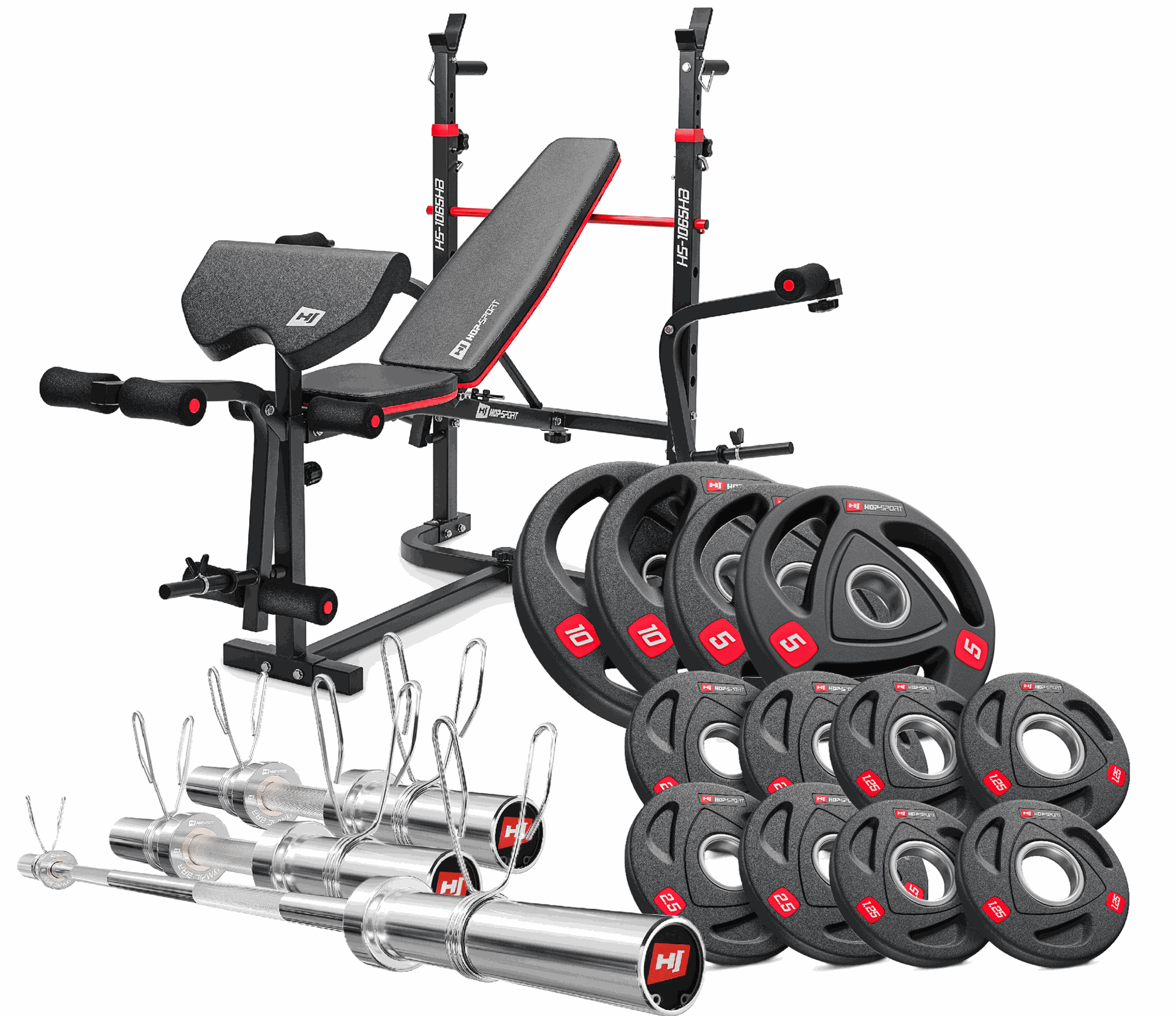 This versatile strength kit includes the Hop-Sport HS-1065HB Pro Workout Bench with preacher curl pad, 1x 120 cm 2x 50 cm Olympic barbells (50 mm) with rotating sleeves, and a complete set of rubber-coated plates (2×10 kg, 2×5 kg, 4×2.5 kg, 4×1.25 kg), for a total of 80 kg. Together, they create a compact yet professional-grade setup that allows you to perform full-body workouts in the comfort of your home gym.