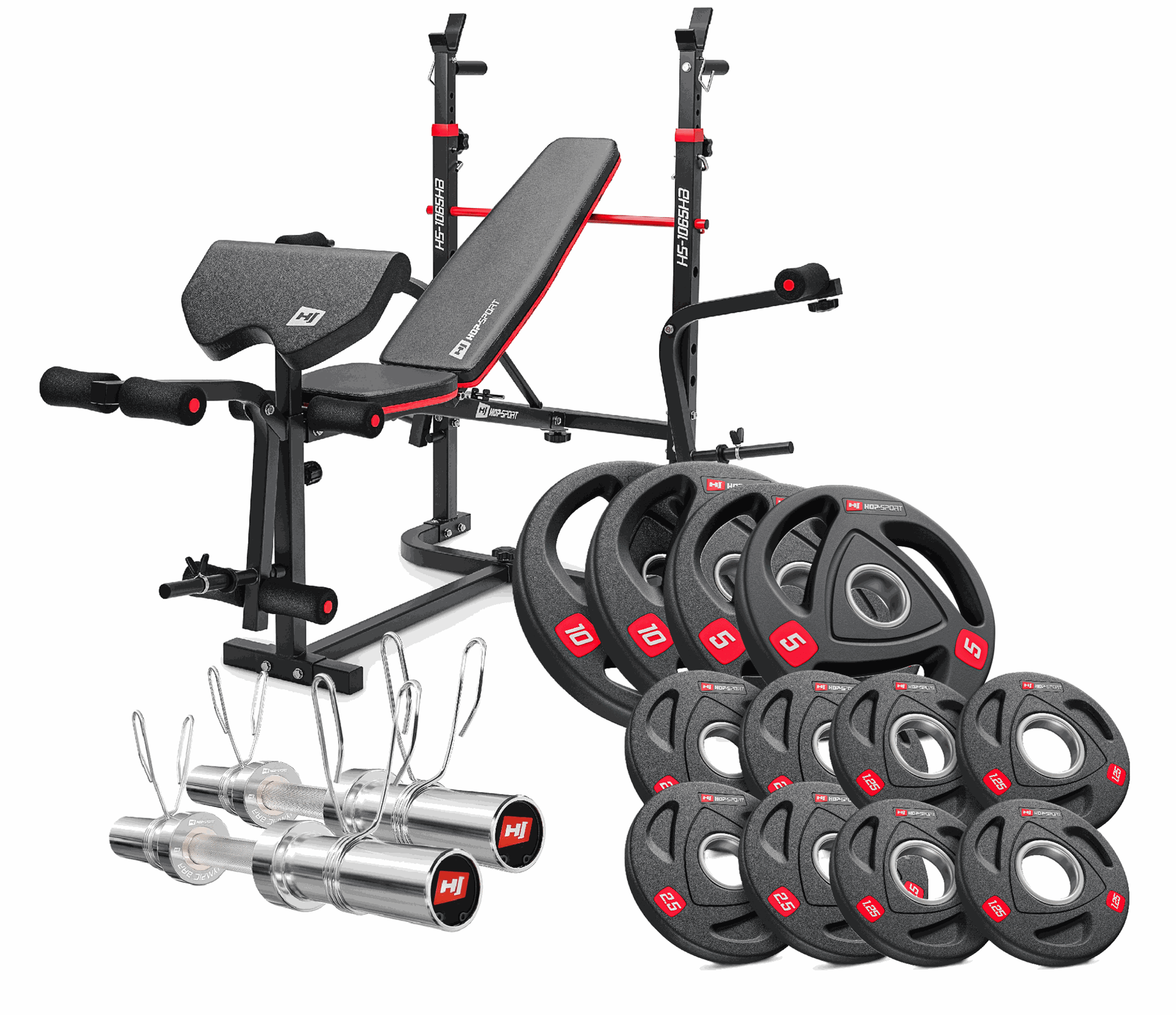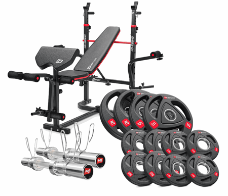 This versatile strength kit includes the Hop-Sport HS-1065HB Pro Workout Bench with preacher curl pad, a 120 cm Olympic barbell (50 mm) with rotating sleeves, and a complete set of rubber-coated plates (2×10 kg, 2×5 kg, 4×2.5 kg, 4×1.25 kg), for a total of 80 kg. Together, they create a compact yet professional-grade setup that allows you to perform full-body workouts in the comfort of your home gym.