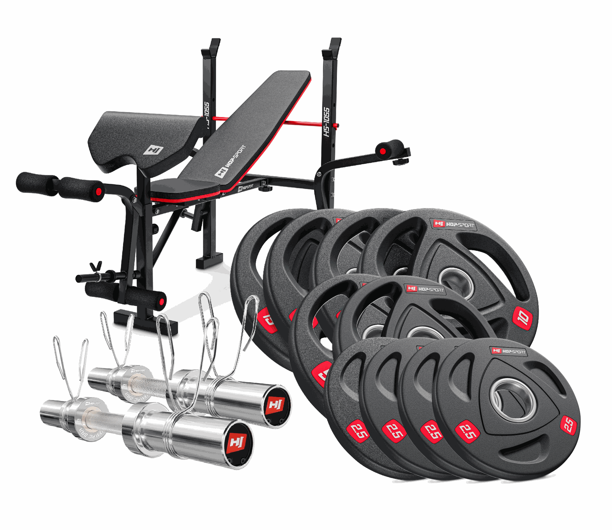 The Hop-Sport Intermediate Power Pack 120 kg is a professional home gym kit that includes an adjustable HS-1055 Pro training bench with preacher curl pad, two 120 cm Olympic barbells (50 mm) with rotating sleeves, and a full set of cast iron plates coated with protective rubber (2×15 kg, 2×10 kg, 2×5 kg, 4×2.5 kg). This comprehensive set is designed for intermediate users who want to build muscle strength and endurance at home.
