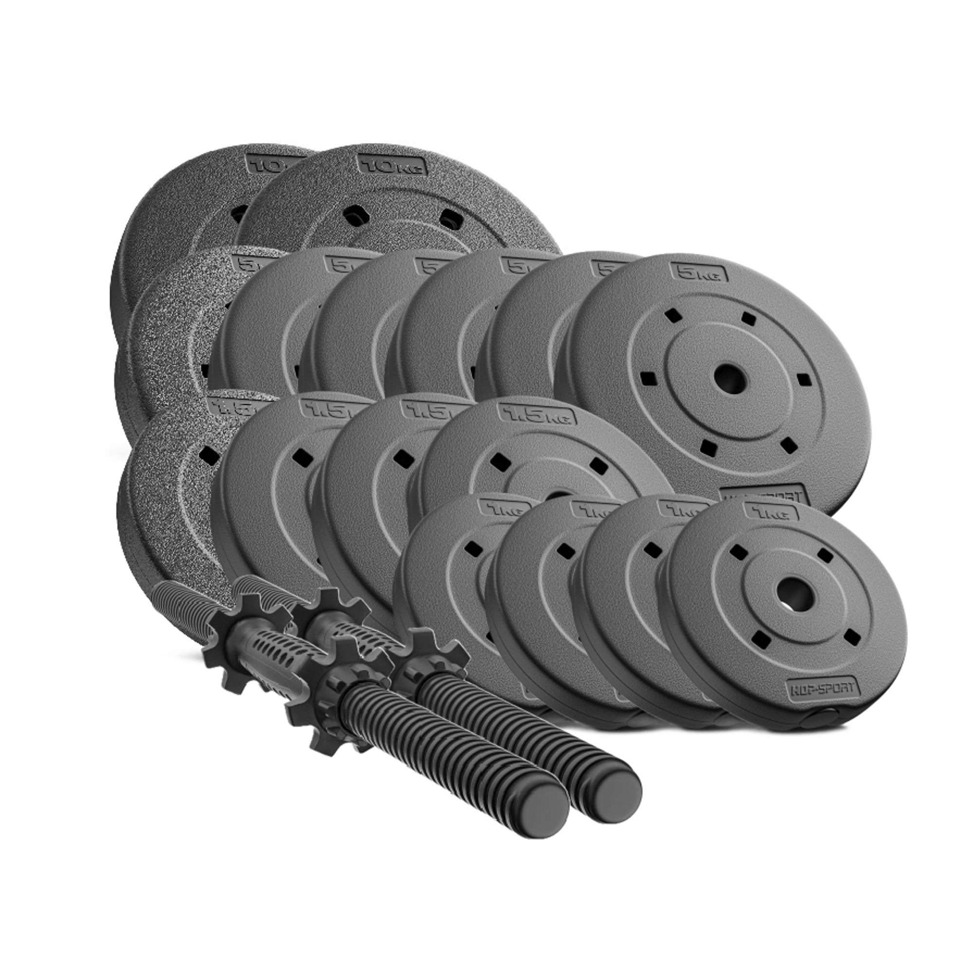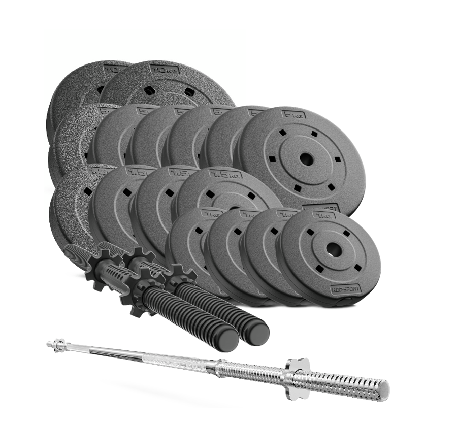 This kit supports a wide range of strength exercises, helping you target all major muscle groups effectively. Perform bicep curls, triceps extensions, shoulder presses, bent-over rows, squats, and chest presses — all using one versatile setup. The dual-bar design lets you switch easily between dumbbell and barbell-style training, maximizing the variety of your workouts. Compact and easy to store, the Hop-Sport 60 kg barbell set is a complete, space-efficient solution for achieving professional training results right at home.