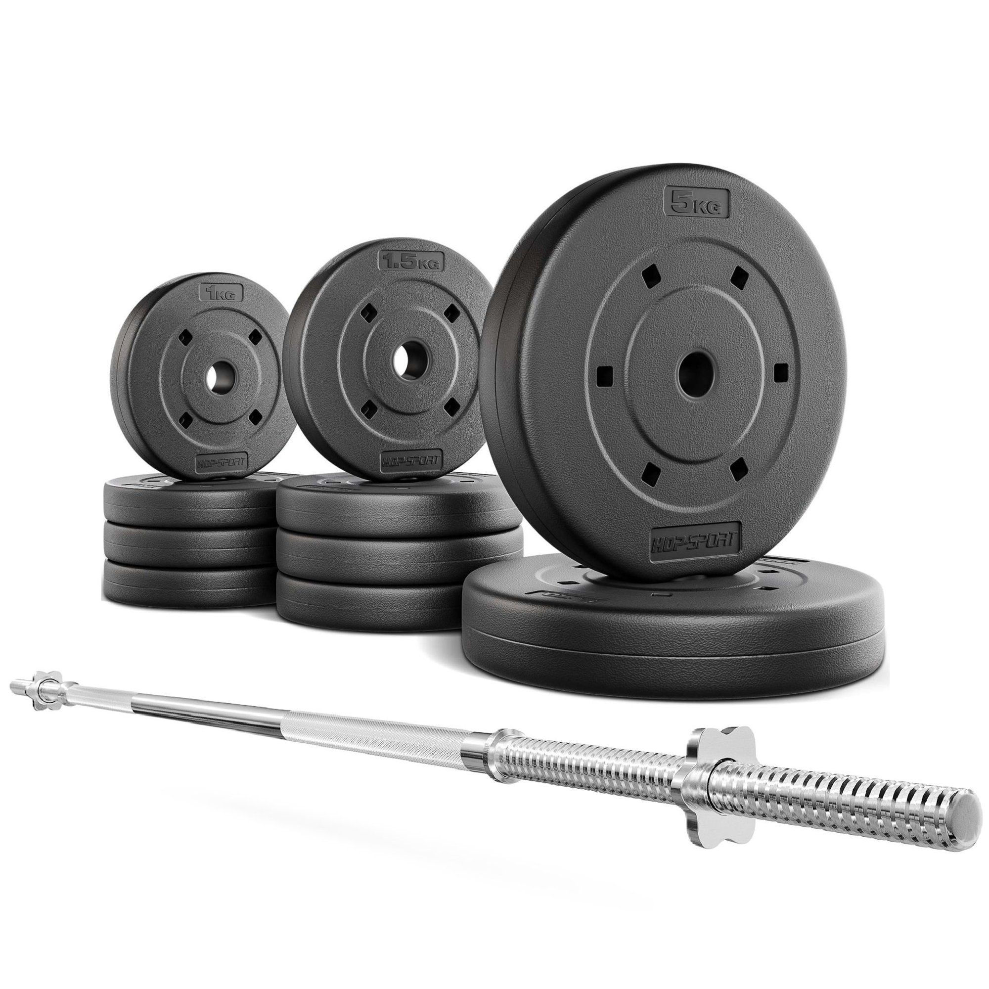 A compact, quiet barbell for beginners: the Hop-Sport Starter Set 20 pairs a 120 cm / 25 mm straight bar with 20 kg of composite plates (28 mm) in small, easy jumps (2×5 kg, 4×1.25 kg, 4×1 kg). Composite construction is floor-friendly and reduces noise; star collars secure every rep.
